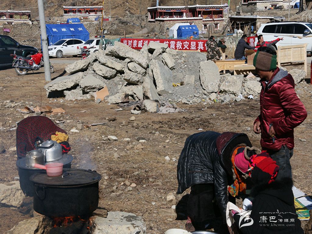 走進八美鎮(zhèn)重災區(qū)中古村災民安置區(qū),第一眼就能看見戴著紅袖章的兩個村民正圍著兩個大灶轉來轉去忙個不停。村民巴青老人說:“災后,我們隊的村民都集中安置在這里,為方便受災群眾和前來幫忙的干部都能喝上一口熱茶,我們幾個村民臨時搭建了兩個‘三鍋莊’灶臺,用來燒清茶和開水,因為我們知道有些干部習慣喝白開水,就特意準備了一個燒白開水的鍋。”他指著正在搶修房屋的黨員服務隊說:“地震發(fā)生到現(xiàn)在,很多領導來看望我們,很多干部到村上幫助搶修房屋、運送物資,這么冷的天,他們一直不停地在幫我們做事情,很辛苦!我們不能光等著干部們來給我們做事情,我今年68歲,雖然做不了大的事,但是給他們燒茶遞水是沒有問題的。”