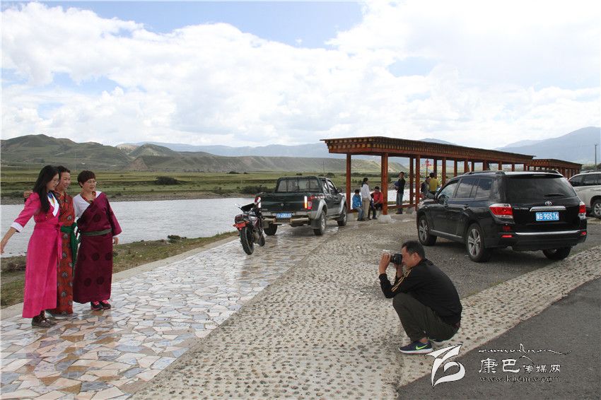 游客在理塘濯桑無量河觀景臺拍照留影。