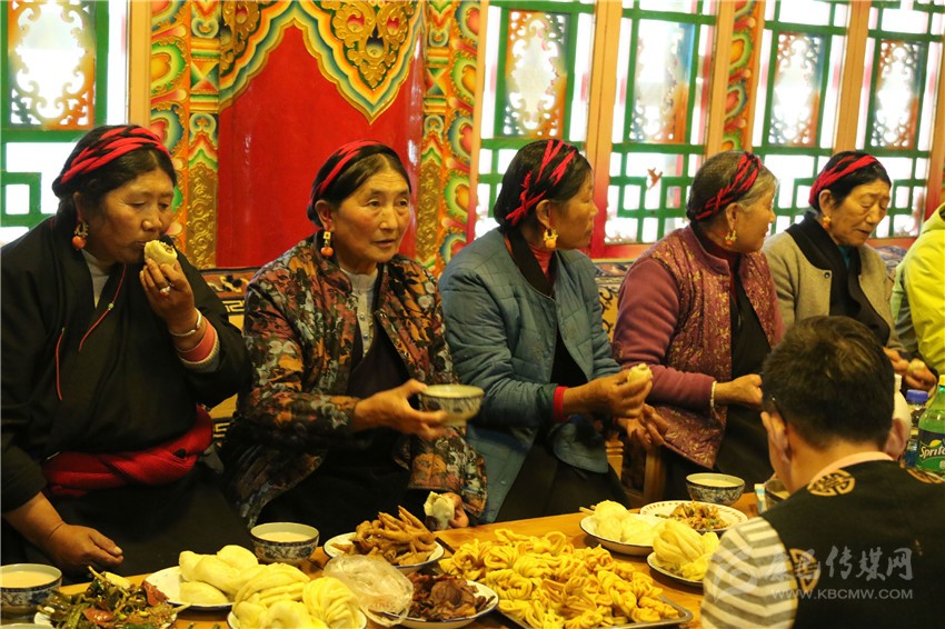 下午3點(diǎn),果子、各種菜品、熱騰騰的包子端上來了,各種飲料擺滿桌子,親朋好友十余口人聚在澤絨多吉的新家中,端起最愛的瓊(用青稞釀成的酒),在歡歌笑語中迎接藏歷火雞新年的到來。