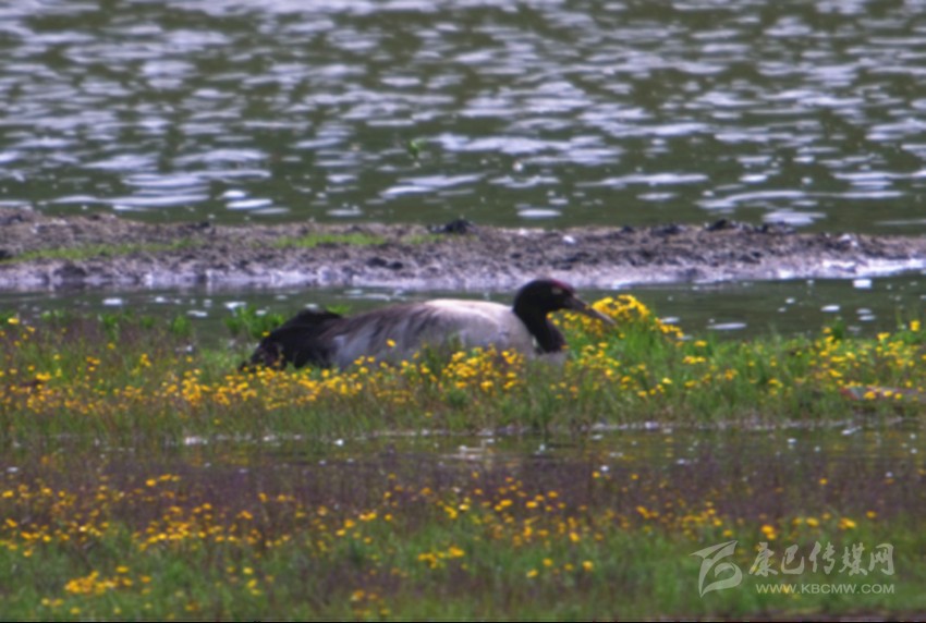 黑頸鶴是唯一生長繁殖在高原的鶴類,國家一級(jí)保護(hù)動(dòng)物,冬季10月左右遷往云貴高原等低緯度地區(qū),2月下旬陸續(xù)返遷回到高原,到達(dá)白玉縣保護(hù)區(qū)時(shí)間一般在4月下旬。這次黑頸鶴繁殖巢穴位于麥拉降措湖邊一塊四面環(huán)水的平臺(tái)上,鮮花盛開,相對隱秘。