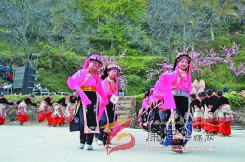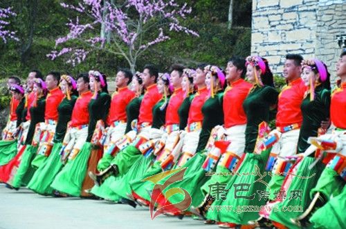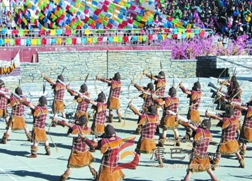10月26日,在甲居藏寨,處處洋溢著豐收和歡樂的氣氛,人們扶老攜幼,身著節(jié)日的盛裝走到一起,來共同慶祝丹巴嘉絨風(fēng)情節(jié)的順利召開。在一塊空地中,搭建了臨時(shí)的舞臺(tái),看臺(tái)上,幾座古碉模型傲然挺立,在不遠(yuǎn)處,一座古碉矗立在一座小山包上,與古碉模型遙相呼應(yīng)、相映成趣。上午9時(shí)40分,當(dāng)節(jié)目主持人宣布嘉絨風(fēng)情節(jié)正式開始時(shí),一束束搖曳的煙花向空中飛去,在空中炸響后,散發(fā)出五顏六色的煙霧,其中有的還幻化成幾多小小的降落傘,就像多多盛開的鮮花在空中綻放。演出現(xiàn)場前的大地和遠(yuǎn)處的小山坡上到處都站滿了熱情的觀眾,合著禮花的爆裂時(shí)的響聲,將手中的小紅旗展開,高舉過頭頂,有節(jié)奏的左右搖動(dòng),霎時(shí)間,整個(gè)現(xiàn)場成為了紅色的海洋。