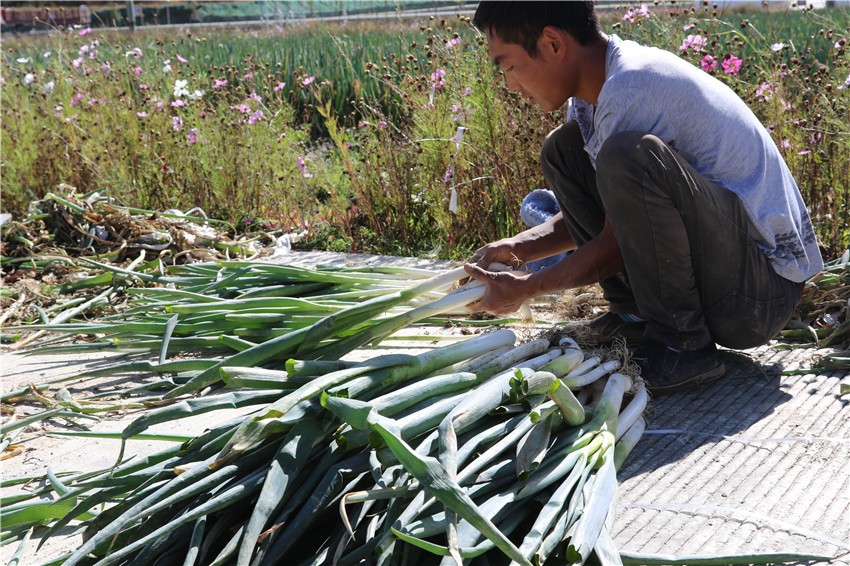 筆者看到,充翁格美熟練地先用鏟子從田地的側(cè)面挖下去2寸深,將大蔥拔出來撣去根須的泥土,然后將斷根的、中等的、大的大蔥分別堆放,每15斤左右打捆,每10捆過稱后搬運裝車。據(jù)他介紹,現(xiàn)在基地的大蔥每周要裝兩次車,每次裝10噸。