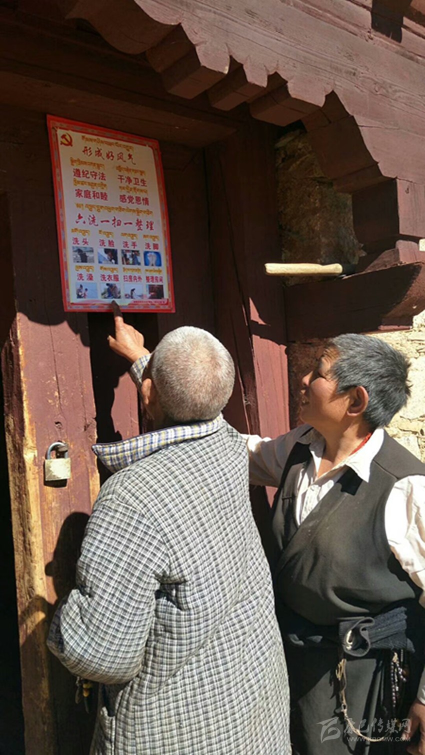 在進(jìn)村入戶(hù)講解宣傳的基礎(chǔ)上,充分利用廣場(chǎng)LED顯示屏、QQ群、微信群、手機(jī)短信等多種方式大力宣傳“六洗一掃一整理”的好習(xí)慣、好風(fēng)氣,加大宣傳力度,使農(nóng)牧民群眾知曉好習(xí)慣、好風(fēng)氣是什么,如何做。在甲洼鎮(zhèn)俄頂村,48戶(hù)村民將藏漢文配圖的“形成好風(fēng)氣”和“六洗一掃一整理”掛牌掛在院內(nèi)顯眼處,確保每天能隨時(shí)提醒他們,在嚴(yán)格要求自己的同時(shí)將牌上內(nèi)容落實(shí)到行動(dòng)上。掛牌后,村“兩委”、駐村第一書(shū)記和黨員在起好帶頭作用的同時(shí),還負(fù)責(zé)督促檢查。老黨員格絨拉姆說(shuō):“紅牌掛在墻上,村民牢記心中,我們村的環(huán)境衛(wèi)生和村容村貌越變?cè)胶昧??!?/span>