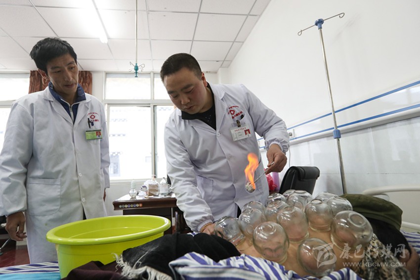 王利洪(右)在輔導(dǎo)學(xué)生扎西澤仁(左)給患者拔火罐。