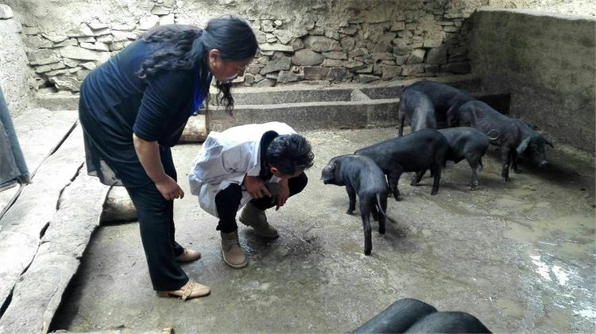 技術員到養(yǎng)殖戶家查看藏黑豬長勢。
