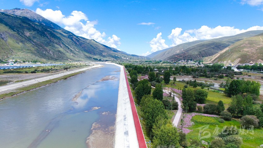 道孚縣實行的“以堤代路”綠化工程,以孜龍大橋為起點,鮮水河大橋為終點,全長2.412公里,沿途的一邊是奔流不息的鮮水河,另一側(cè)是正在建設(shè)的道塢濕地公園,不遠處種植的藏杏花正在悄然開放,鍛煉的間隙還能眺望雪山,走在其間感覺神清氣爽?!耙缘檀贰本G化工程的路面是富有彈性的膠粘石路,它能迅速把降水滲入地下,起到了維護生態(tài)平衡的作用,同時路面還不易積雪,也保障了行走安全。