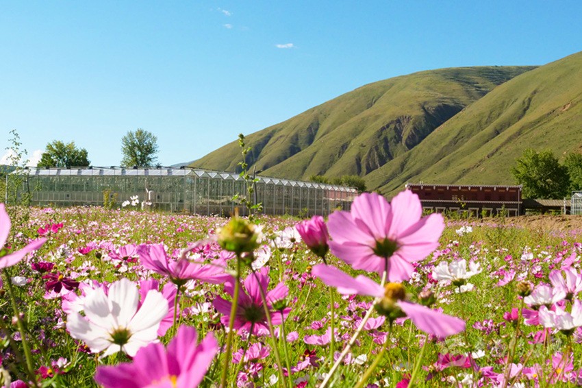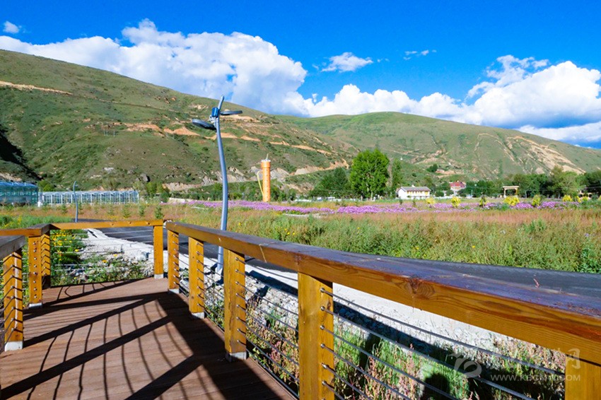 陽光下,成片開放的波斯菊搖曳生姿,成片白楊林包圍著12個16—25平方米不等的仿道孚民居外觀的樹屋,沿著鵝卵石鋪設(shè)、牡丹點綴的棧道漫步,兩側(cè)種植著落葉松、金葉垂榆、康定木蘭、五小葉槭等32種具有高原特色的植物,樹下種植以虞美人、百葉菊等17種花卉為主的草本植物;來到湖心島,不少人坐在其間休閑,有的坐在樹下乘涼,有的坐在溪邊聊天,還有不少人在伸臂橋上照相,不遠處透明的玻璃溫室展覽館已經(jīng)完成建設(shè),走過開滿桃花的拱形門,陽光灑在地面上讓人心生暖意,廢棄的水塔變成了打酥油茶用的醬桶,山、水、溪、樹、花、屋構(gòu)成了不同意境的高原園林景觀。