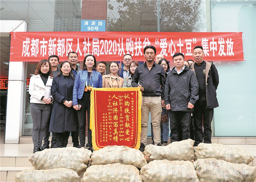 “感謝你們幫助認(rèn)購3萬余斤土豆……扎西德勒!”11月6日上午8點(diǎn)36分,“愛心土豆”車隊(duì)剛在新都區(qū)人社局停車場(chǎng)停穩(wěn),降央吉村一個(gè)躍步下車,為等候多時(shí)的人社局送上“認(rèn)購扶貧獻(xiàn)愛心、人社濟(jì)困寫真情”的錦旗。