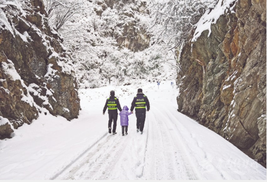 晨間,山谷滿是積雪,氣溫已降至零下??吹巾旓L(fēng)冒雪如期而至的民警,原本又驚又怕的受困游客看到了希望??陆鹳F和戰(zhàn)友們一方面安撫他們,另一方面合力將事故車輛移開,并帶領(lǐng)受困人員安全離開事發(fā)區(qū)域。
