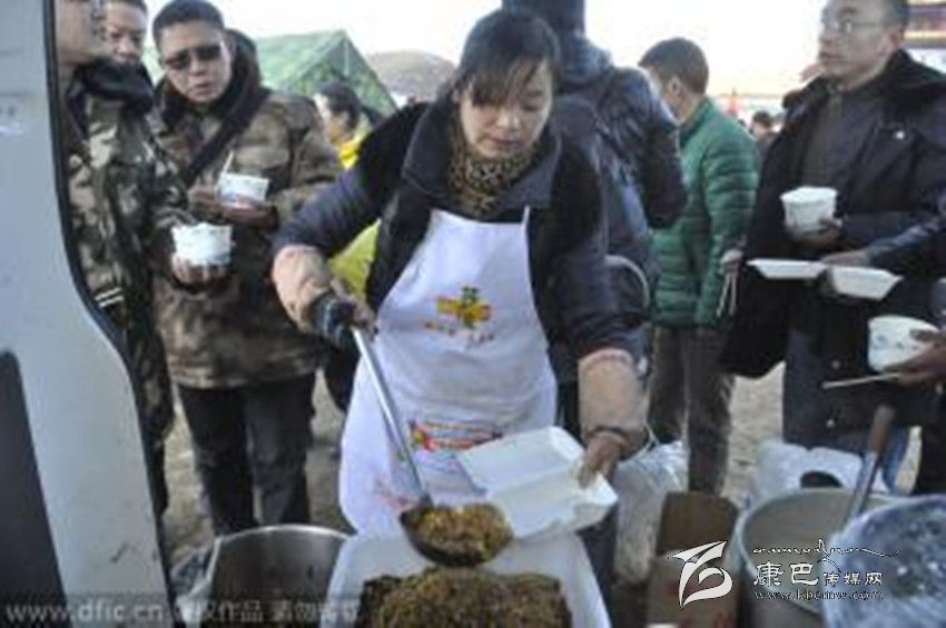 據(jù)了解,韓大哥是這家飯店的老板之一,他是仁壽縣人,幾年前和朋友來(lái)到新都橋開(kāi)始經(jīng)營(yíng)飯店。康定6.3級(jí)地震發(fā)生時(shí),他人在成都。但看到災(zāi)情發(fā)生,韓大哥立即和飯店另外幾個(gè)合伙人決定到安置點(diǎn)免費(fèi)送盒飯,“我在當(dāng)?shù)刈隽?、7年生意,現(xiàn)在出了事情,就應(yīng)該伸手支援嘛!”據(jù)韓大哥介紹,此次地震發(fā)生后,新都橋80%左右的飯店都已經(jīng)關(guān)門(mén),他們的飯店因?yàn)檫€有一些接待工作,仍在正常營(yíng)業(yè)。自11月23日晚上,他家的飯店就主動(dòng)為塔公鎮(zhèn)的安置點(diǎn)免費(fèi)派送盒飯,“包括中午和晚上兩頓,兩葷兩素一湯的配置。”因?yàn)樘?, 韓大哥來(lái)不及仔細(xì)統(tǒng)計(jì),他大概知道每天送出的盒飯?jiān)?200盒到1500盒之間,每天送出盒飯的成本在4、5千左右。但在他看來(lái),這些其實(shí)都算不上什么,“能為災(zāi)區(qū)出一份力,我們就很滿(mǎn)足了,我們打算一直送到抗震救災(zāi)工作結(jié)束,也就是直到災(zāi)民有條件自己做飯的時(shí)候。”“這邊天氣很冷,他們吃的一般是些面包、牛奶之類(lèi)的干糧,我們就是想讓大家吃到熱飯、熱菜。”據(jù)韓大哥介紹,每天飯店都會(huì)派出3、4個(gè)人將盒飯運(yùn)送到安置點(diǎn),“只要有人需要我們都會(huì)分發(fā)盒飯,包括一些志愿者和武警官兵也吃我們的飯。
