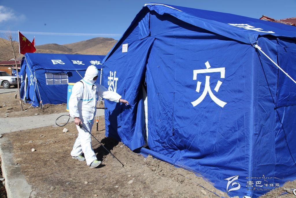 在離武警武警四川總隊二支隊的醫(yī)務(wù)站不遠(yuǎn)的地方,新都橋中心衛(wèi)生院的衛(wèi)生員羅衛(wèi)強正“全副武裝”的為每一頂帳篷做著消毒。羅衛(wèi)強說:“我們從地震第一天到現(xiàn)在一直堅守在一線,22日到26日都在祖慶小學(xué)進(jìn)行消毒工作,27日和其他工作人員換班到了江巴牧民新村安置點。我們每天會早上一次,晚上一次對每一間帳篷進(jìn)行兩次消毒。除了我們,康定縣疾控中心的工作人員還會每天進(jìn)行一次消毒,我們都在盡最大的努力保證牧民生活環(huán)境的衛(wèi)生。”在對環(huán)境進(jìn)行消毒后,他又來到醫(yī)療就助點為前來就醫(yī)的甲瑪它看起病來。