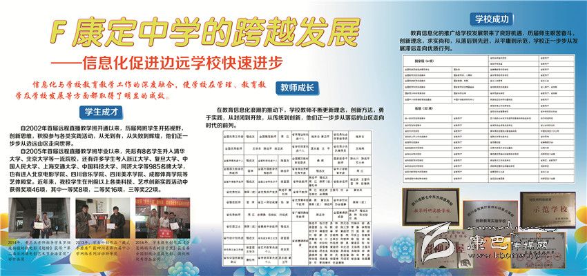 2002年以來康定中學(xué)立足民族地區(qū)教育實(shí)際,依托成都七中優(yōu)質(zhì)教育,先后開通成都七中高中直播班、初中錄播班,建成初中遠(yuǎn)程直錄播教學(xué)AB平臺(tái),實(shí)現(xiàn)了與國內(nèi)名校共享優(yōu)質(zhì)教學(xué)資源的目標(biāo),將網(wǎng)課教學(xué)打造成學(xué)校教育品牌。經(jīng)過近5000名師生員工的不懈努力,2013年來,康定中學(xué)連續(xù)4年高考硬上本科人數(shù)突破200人大關(guān)。先后有8名學(xué)生被北京大學(xué)和清華大學(xué)錄取。中考綜合評比連續(xù)9年保持全州第一。
