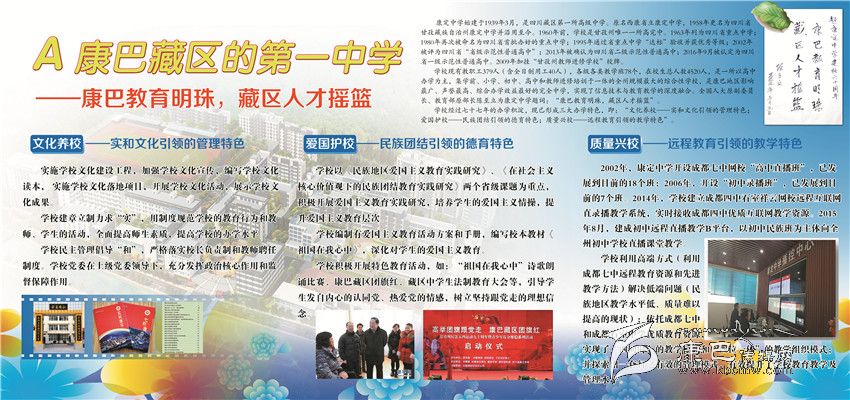 輝煌業(yè)績俱往矣,而今邁步從頭越??刀ㄖ袑W(xué)成功創(chuàng)建四川省一級示范性普通高中,康定中學(xué)歷史翻入新的一頁。學(xué)校將圍繞“建盛德實(shí)學(xué)康中校,做豪邁和美康中人”的“康中夢”,把康中打造成全州基礎(chǔ)教育窗口、全省中學(xué)教育名校、全國藏區(qū)教育典范。