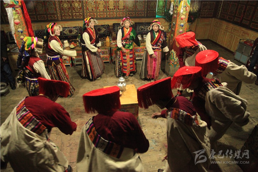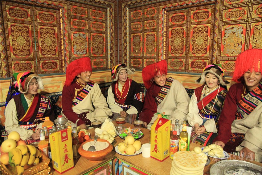 一家人穿上節(jié)日盛裝,按輩序就座。主婦手捧吉祥斗恭恭敬敬地走到長輩跟前說“扎西德勒”,對方抓幾粒麥子邊向上撒邊祝福說:“扎西德勒!美滿幸福,祝主婦身體健康,預(yù)祝明年大家仍如此團聚歡慶?!痹僮ヒ稽c切瑪送進嘴里。家庭儀式后,家中兩人一個拿青稞酒、銀酒碗,一個手捧切瑪,到左鄰右舍、親朋好友家拜年,敬獻(xiàn)切瑪、青稞酒,互相祝福。