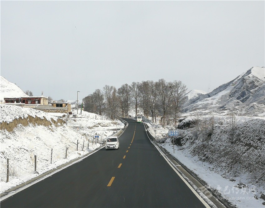 安全通過(guò)折多山后,天已完全放亮,只見(jiàn)道路兩邊的山丘、草地和樹(shù)木全被積雪覆蓋,與之形成鮮明對(duì)比的是一條寬闊平整的黑色柏油路,整個(gè)畫(huà)面就像一幅水墨畫(huà),而我們這車(chē)人就行進(jìn)在“畫(huà)中”。