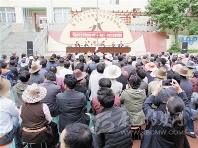 在雅江縣河口鎮(zhèn)希望小學(xué)的廣場(chǎng)上,來(lái)自全鎮(zhèn)各村的430名群眾齊集一堂,認(rèn)真聆聽宣講團(tuán)成員其美貢布和劉美翁姆的宣講。