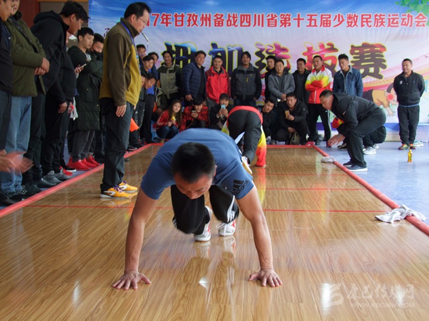 “在地上劃兩條平行線作為河界,中間劃一條中界,準(zhǔn)備一條長約4米的繩子式布帶并兩端打結(jié)。比賽進(jìn)行時(shí),雙方各自把繩子套在脖子上,兩人相背,將賽繩經(jīng)過腹胸部從襠下穿過,然后趴下,雙手著地,賽繩拉直,聽到比賽開始的口令后,兩人用腿腰肩頸的力量拖動(dòng)布帶奮力向前爬,以將紅布標(biāo)志拉過河界者為勝。押加是在藏區(qū)特殊的自然環(huán)境和獨(dú)特的民族生活習(xí)俗基礎(chǔ)上產(chǎn)生的,在第一屆至第五屆全國民族運(yùn)動(dòng)會(huì)中押加為表演項(xiàng)目,1999年第六屆全國民族運(yùn)動(dòng)會(huì)上押加被正式定為競(jìng)賽項(xiàng)目?!笨吹接^眾們對(duì)押加比賽充滿了好奇,教練員呂長林主動(dòng)介紹說。