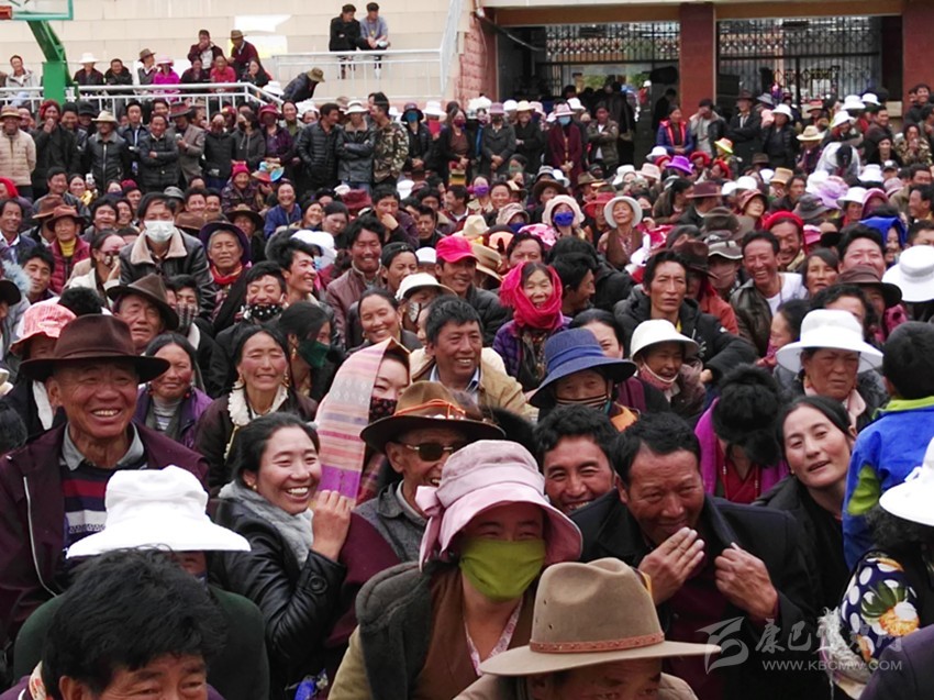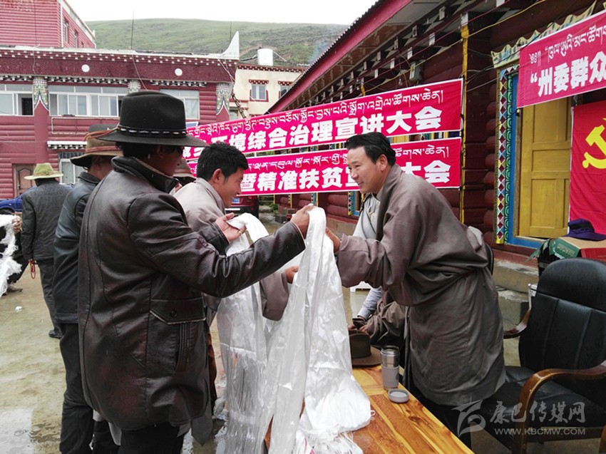 聆聽宣講的群眾向松吉尼瑪敬獻哈達。