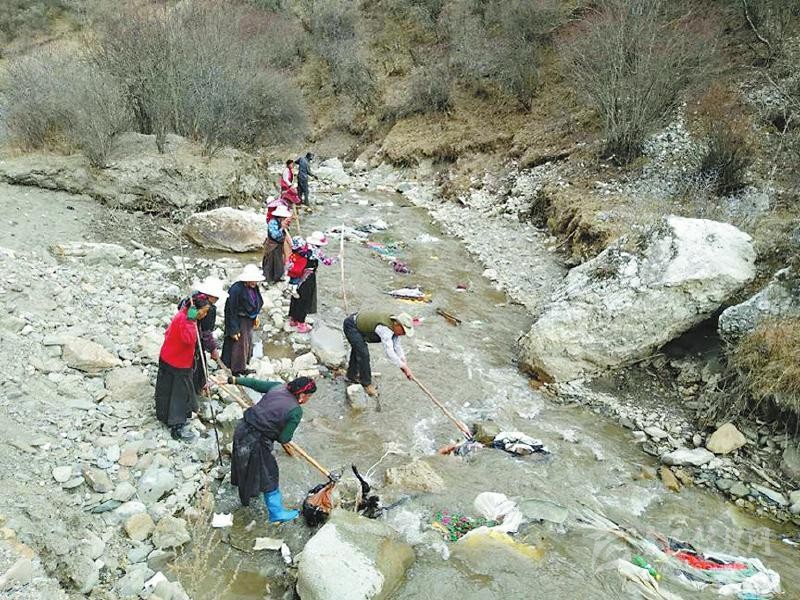 說干就干,黃先明帶領(lǐng)駐村工作隊(duì)隊(duì)員和村兩委班子成員不畏嚴(yán)寒,首先把全村的道路、公共設(shè)施場(chǎng)地進(jìn)行了清掃,把道路兩邊的小土堆全部鏟平并種上花草,把村民房前屋后的柴火、廢料等重新清理并制定擺放標(biāo)準(zhǔn)。在河道整治中,黃先明帶領(lǐng)村干部沖在前面,對(duì)不容易清理到的垃圾,還跳到河里去撿。3月的高原還很冷,鞋子很快被交納河水打濕,但大家全然不顧?!包S隊(duì)長都帶頭干,我們更要努力。”交納村村民巴登鄧珠說。