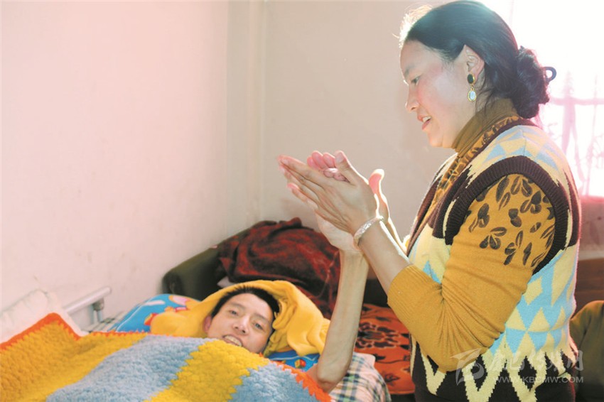 因?yàn)楦q的意外事故,家里沒有了經(jīng)濟(jì)來源。巨大的經(jīng)濟(jì)壓力,讓白措喘不過氣來。但她沒有向命運(yùn)低頭,撫育3個(gè)孩子,就近務(wù)工掙錢補(bǔ)貼家用。同時(shí),利用工作間隙回家,照顧丈夫吃飯,給他翻身,換洗沾滿屎尿的墊布……因?yàn)閾?dān)心丈夫久臥生褥瘡和肌肉萎縮,白措每隔3小時(shí)就要給丈夫翻身,還自學(xué)了一套按摩手法替根絨全身按摩。在她的精心照料下,根絨身體慢慢得到了康復(fù)。