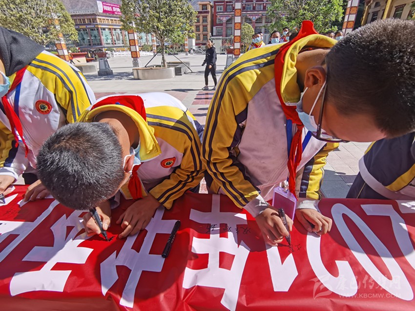 巴塘縣青少年在啟動(dòng)儀式上簽字,倡導(dǎo)全民閱讀。