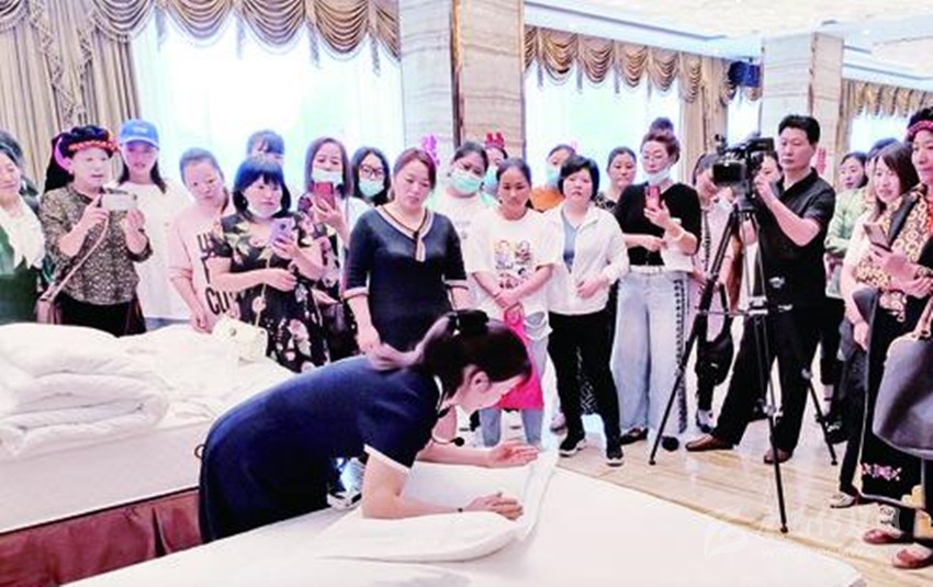 先檢查床箱與床墊是否吻合,床墊拉出40公分,鋪床前撣去床上毛發(fā),接下來開始甩單,床單正面朝上,床單中線居中,兩邊吊邊均等,甩單動作簡單瀟灑,準確到位。這是7月8日,稻城縣文旅行業(yè)從業(yè)人員培訓會上,筆者見到學員在教師的指導下表演的精彩一幕。