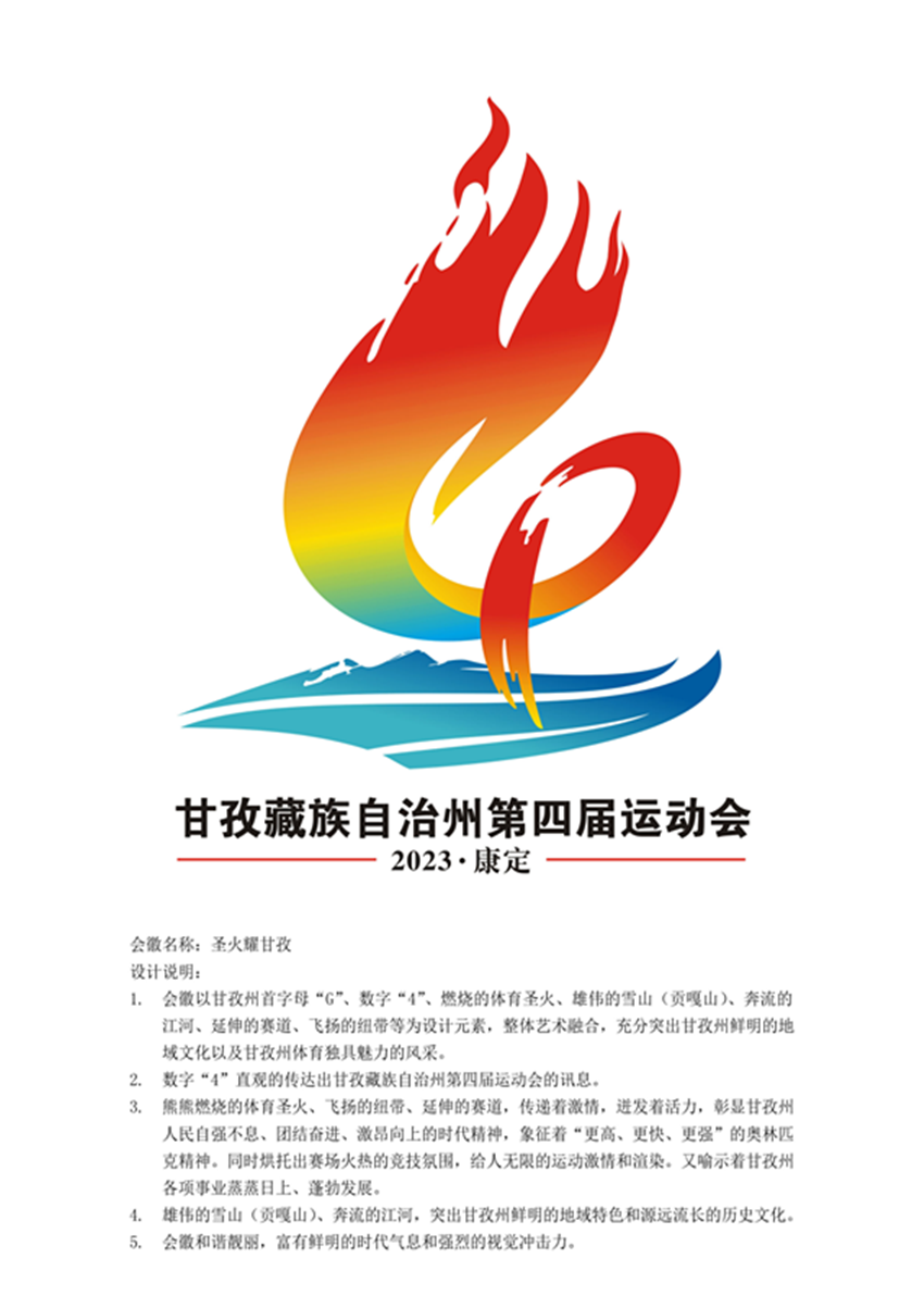 據(jù)王拓進(jìn)介紹,會徽設(shè)計靈感來自網(wǎng)上看到的貢嘎雪山,所以作品以甘孜州首字母“G”、數(shù)字“4”、燃燒的體育圣火、雄偉的雪山(貢嘎山)、奔流的江河、延伸的賽道、飛揚的紐帶等為設(shè)計元素。數(shù)字“4”直觀地傳達(dá)出甘孜州第四屆運動會的訊息;雄偉的雪山(貢嘎山)、奔流的江河,突出甘孜州鮮明的地域特色和源遠(yuǎn)流長的歷史文化;熊熊燃燒的體育圣火、飛揚的紐帶、延伸的賽道,傳遞著激情、迸發(fā)著活力,彰顯甘孜州人民自強不息、團結(jié)奮進(jìn)、激昂向上的時代精神,象征著“更高、更快、更強”的奧林匹克精神,同時烘托出賽場火熱的競技氛圍,給人無限的運動激情和渲染,又喻示著甘孜州各項事業(yè)蒸蒸日上、蓬勃發(fā)展。