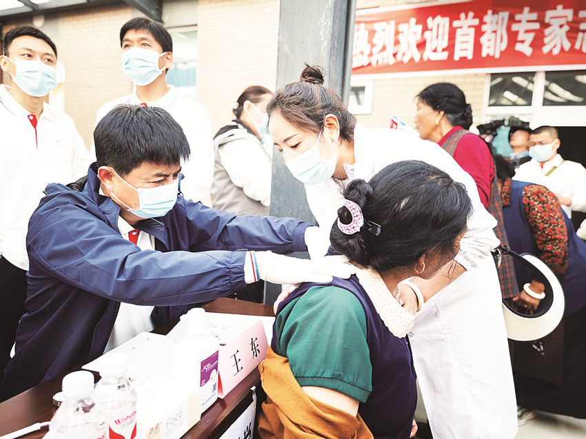 排隊、分診、診斷……在巴塘縣義診現(xiàn)場,每一位身著白衣、口音輕柔的醫(yī)生面前都有數(shù)名等待問診的群眾。來自北京大學(xué)第一醫(yī)院、解放軍第八醫(yī)學(xué)中心、北京航天總醫(yī)院等醫(yī)療機(jī)構(gòu),涵蓋腎臟、中醫(yī)、骨科、肝病科疾病等多個領(lǐng)域的專家團(tuán)隊正為前來問診的群眾提供多學(xué)科專業(yè)義診服務(wù),并就常見疾病耐心細(xì)致地為患者及家屬答疑解惑。