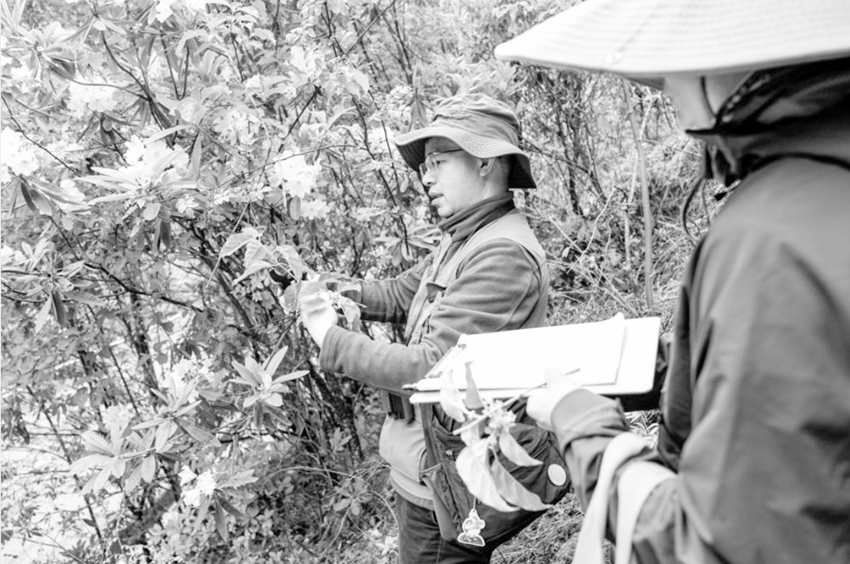 回到山腳,張遠(yuǎn)彬正在打開植物“盲盒”。“這里海拔差別大,杜鵑的種類特別多,這是以前沒有記錄到的?!睆堖h(yuǎn)彬直呼“驚喜”,邊用手機(jī)拍下形態(tài),邊口述特征讓一旁的助手記錄。