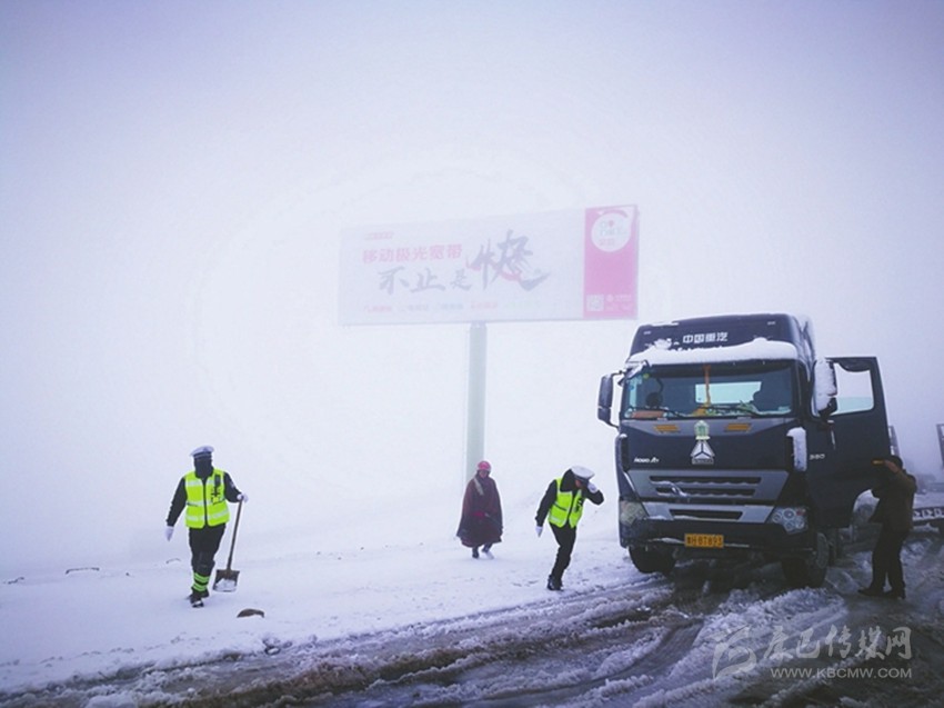 交警在折多山的風雪中疏導交通。