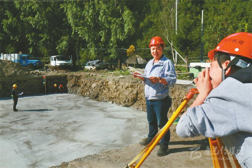 甘孜州醫(yī)療廢物集中處置設(shè)施建設(shè)現(xiàn)場(chǎng),工人測(cè)量墊層標(biāo)高。