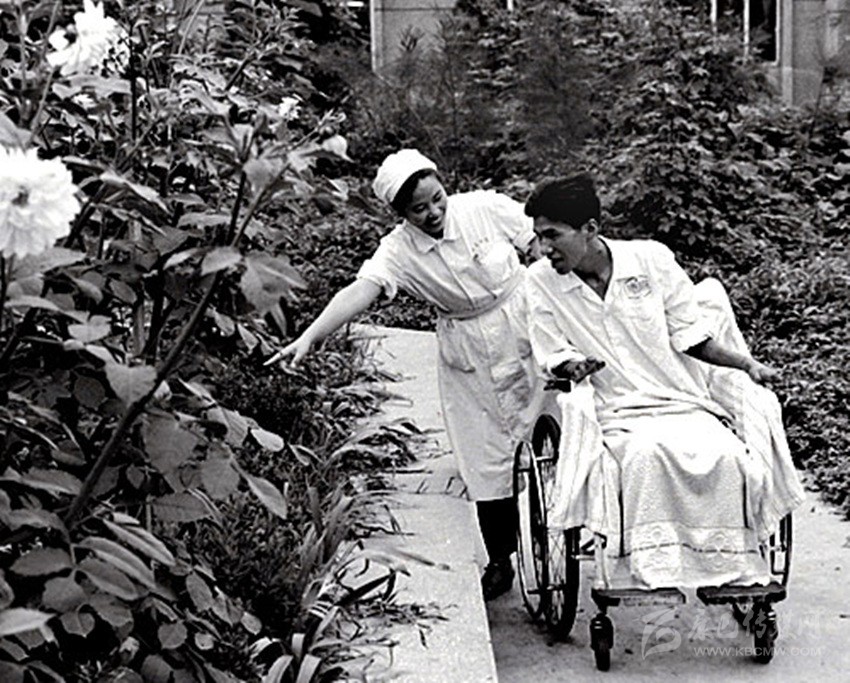松田宏也在四川醫(yī)學(xué)院附屬醫(yī)院護士長陳克芳的護理下來到花園里。 資料圖片