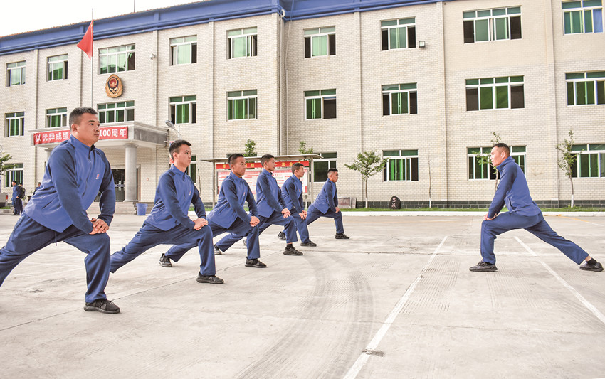 張大雄在帶領(lǐng)中隊(duì)人員開(kāi)展體能訓(xùn)練。