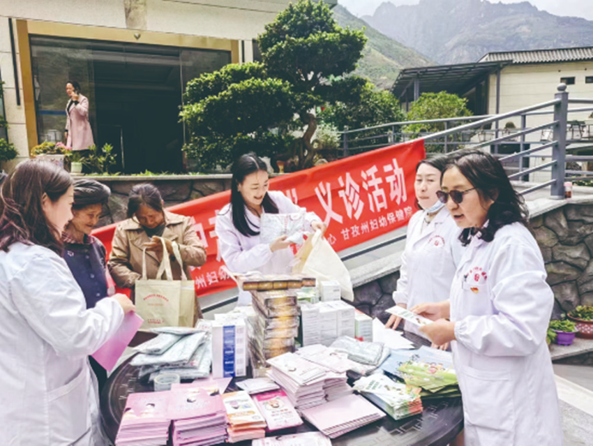 醫(yī)護(hù)人員為婦女群眾發(fā)放健康知識“大禮包”。