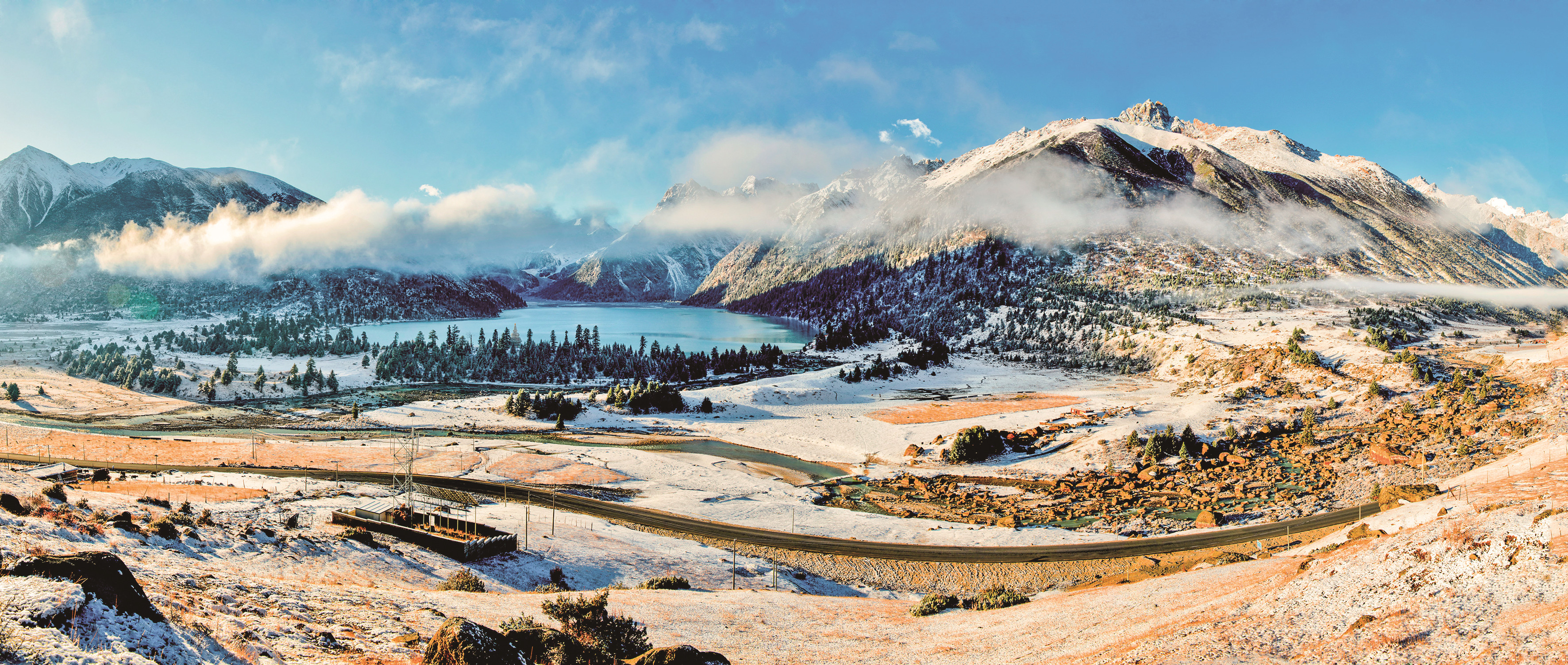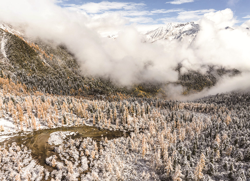 雪山、藍(lán)天白云和黨嶺村的彩林構(gòu)成一幅優(yōu)美的畫(huà)卷。新華社 發(fā)