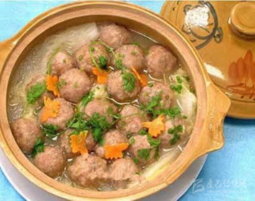 4、用微火把菜鍋中的酥油化成液體后加入生姜片、鹽、野生蒜、少量水、水?dāng)嚩狗?,煨成出現(xiàn)沸泡的時(shí)候,澆在魚肉丸子上蟲草魚肉丸這道菜做成了。