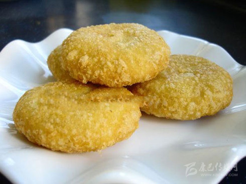3.包餡成型:用皮坯包上餡心,收好口,再用手把餅坯做成邊沿較厚、中間稍薄的氈帽狀即成餅坯。4.炸制:把菜油燒成七成熟,將餅坯從鍋邊滑入鍋內(nèi)炸至色澤金黃,皮酥即成。產(chǎn)品特點(diǎn) 皮酥脆,內(nèi)軟糯,香甜爽口。
