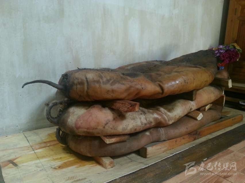 半干豬肉:在丹巴縣革什扎鄉(xiāng)有一種比較奇特的豬肉保存方法:將豬殺死后,不去毛,只在豬的腹部開一條口子取出內臟,將血水清理干凈后用麻繩將腹部縫合。隨后用當?shù)氐狞S泥漿敷在豬身上,在豬的身上形成一個厚約2厘米的殼,密不透風。處理好后將其懸掛于灶塘之上,使黃泥在高溫的烘烤下快速硬化。如若發(fā)現(xiàn)黃泥層出現(xiàn)裂縫,立即用黃泥漿將其修復。等到第二年熱天時,敲掉黃泥形成的硬殼,豬毛被輕松退去,豬肉依然比較新鮮。但這種保存新鮮豬肉的方法現(xiàn)在已經(jīng)很少見了,一是因為這種保存方法風險太大,稍有不慎豬肉就可能腐敗;二是如今物資供應豐富,新鮮豬肉購買方便,使得此種儲存方式失去了存在的價值。