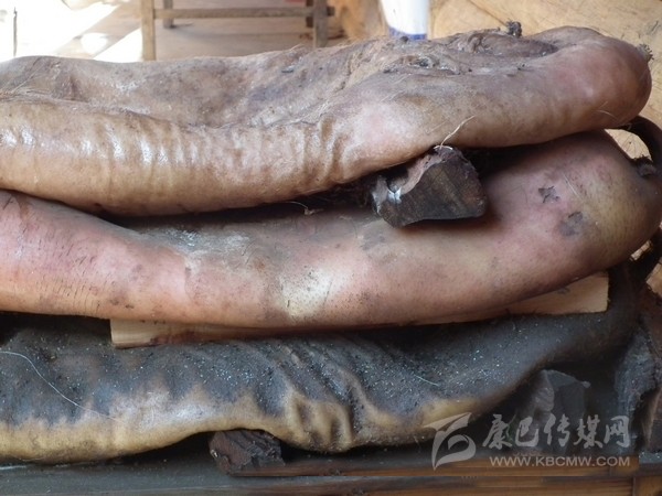 豬膘:在丹巴,豬膘是一種貯存豬肉的方式,是一種飲食習俗,同時,它又是財富的象征。在丹巴隨便走進一戶人家都可以看到少則幾扇、多則十余扇的豬膘掛在樓上,有些人家的豬膘甚至還貯存十多年之久。這些豬膘大多已經(jīng)被蟲吃掉了許多,但是他們也不會心痛,因為在過去,看一個丹巴人家庭是否富裕,就看他家有多少豬膘,豬膘越多就越富有。