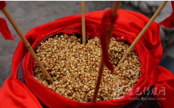 嘉絨語稱“恰鹵”。咂酒是青稞釀制而成的。首先取一定數(shù)量的青稞粒,一般5斤、8斤或10斤,在大鐵鍋中用水煮成八成熟后,放在簸箕里晾開,待冷卻后放上一定比例的酒曲,合勻,又裝入大鐵鍋中發(fā)酵三至四天,待聞到酒香味后,裝入壇中并加水,放置一天以上后,即可取汁食用,這個(gè)汁就是咂酒。咂酒味甘甜淳厚,十 分爽口,看似不醉人,但有的甘甜之中略帶苦澀,說明酒勁足,不勝酒力者應(yīng)少飲為宜。曾有人寫《飲咂酒詩》說:“成石雜糧一甕收,王侯到此也低頭,五龍抱住 撐天柱,咂盡黃河水倒流”。充分展示了咂酒的魅力和飲咂酒的那種愜意。境內(nèi)巴底、半扇門的上半鄉(xiāng)、太平橋鄉(xiāng)一帶的群眾喜愛煮咂酒,平日,家家都備有咂酒,親朋間禮尚往來、人情世故都送咂酒。喝咂酒是當(dāng)?shù)氐囊淮罅?xí)俗?!墩鹿韧椭?略)》記載了清朝后期宅壟土屯區(qū)的飲食習(xí)俗時(shí)說:“夷人(封建統(tǒng)治者對(duì)藏族的貶 稱)寨中置巨甕或木桶,富者大銅瓶盛酒,于內(nèi)植竹竿十余枝,跌坐于地互相吸飲,不杯杓勸酧(酬),無餚核(指熟食的魚肉干果),惟各布豬膘、牛肉、‘得木 鳥’(火燒子饃饃),醉飽而散”?,F(xiàn)在,巴底鄉(xiāng)、半扇門的上半鄉(xiāng)、太平橋鄉(xiāng)的大多數(shù)村寨仍然保留著這些習(xí)俗。在節(jié)日或慶典之時(shí),在大壩子中間放一個(gè)大的壇子或木桶,里面盛滿含有酒糟的咂酒,然后插入麥桿數(shù)根,眾人圍個(gè)大圓圈跳鍋莊,口渴時(shí)依次吸之;或一人手持葫蘆,里盛咂酒,在眾人中依次轉(zhuǎn)之;或眾人盤腿 圍坐,傳一壺咂酒,稱喝“轉(zhuǎn)轉(zhuǎn)酒”。