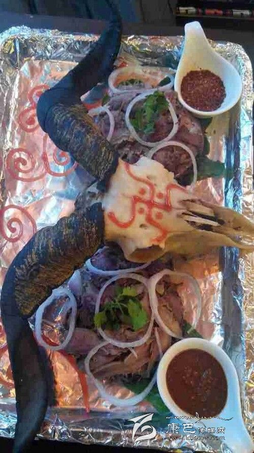 當(dāng)葩姆名卡的主廚把“吉祥羊頭”端上餐桌時(shí),記者首先被它大氣的擺盤所吸引,一只被剝得光光的羊頭放在盤子中間,上面用番茄醬畫上了藏族寓意吉祥的圖案。被剃下來(lái)的羊肉分成兩邊擺放在兩只羊角下,上面用洋蔥和香菜做了裝飾。為了減少羊肉帶給食客的油膩感覺(jué),在羊肉堆下還另有乾坤,用青菜腌制的咸菜藏在下面,一口羊肉一口咸菜,很是爽口。