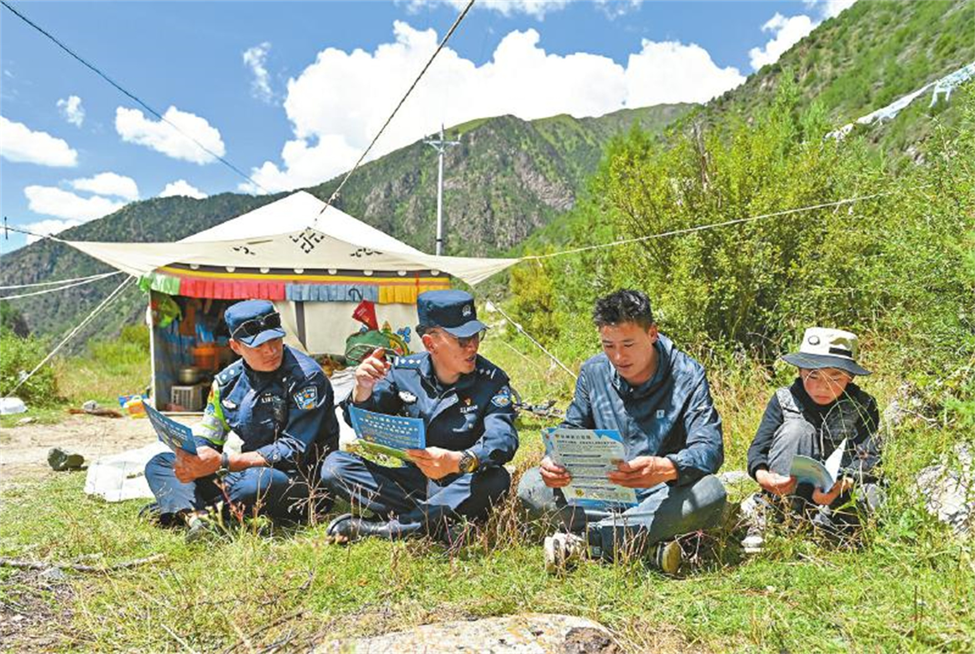 “甲日村有幾戶牧民是前幾天剛遷徙過來的,我們?nèi)ソo他們進(jìn)行一次法治宣講,也去了解下他們有沒有辦理身份證、戶口的需求。他們住在河那邊,出行也不方便?!毖采饺蝿?wù)結(jié)束后,趁著大家吃干糧休整的時間,登真扎巴對大家說。