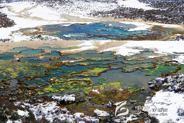泉華灘位于貢嘎山西坡,為鈣化地貌,灘長900多米,寬100余米,依山而下形成5個泉華階地。每個階地上有數十個大小不同、形態(tài)各異的五色彩池,池中有羌活魚自在游弋。在泉華灘的頂上有一道趵突泉,不間斷地突然從地底噴發(fā),十分壯觀。