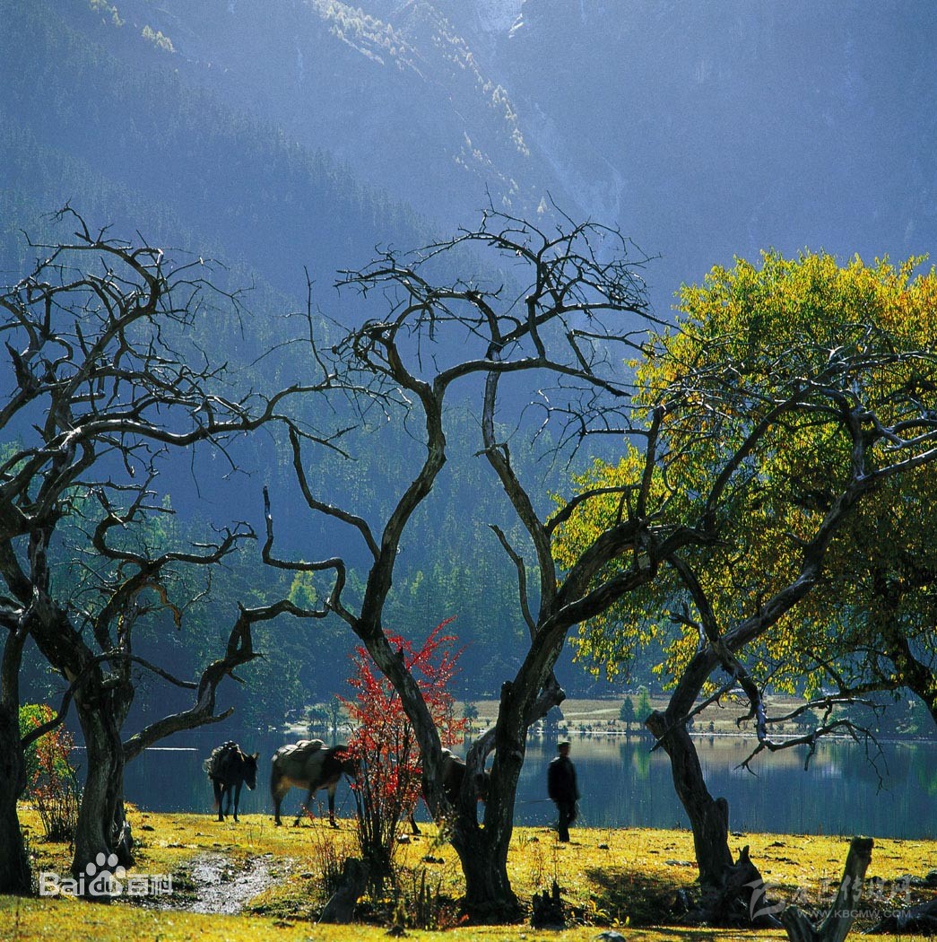 伍須海,湖面海拔3760m,長約1200m,寬為600m,最深處達33m。湖水由冰雪融水和地下水供給,東南泄入伍須溝,匯至九龍河。在伍須海的南北聳立著兩座梳子形的山峰,巍峨壯觀,西方是浪古則雪山,東南邊至朗加達卡山梁,南距伍須鋪子是各具形態(tài)十二姊妹峰。美麗的伍須海幽靜而神奇,完全保持著原始生態(tài)。