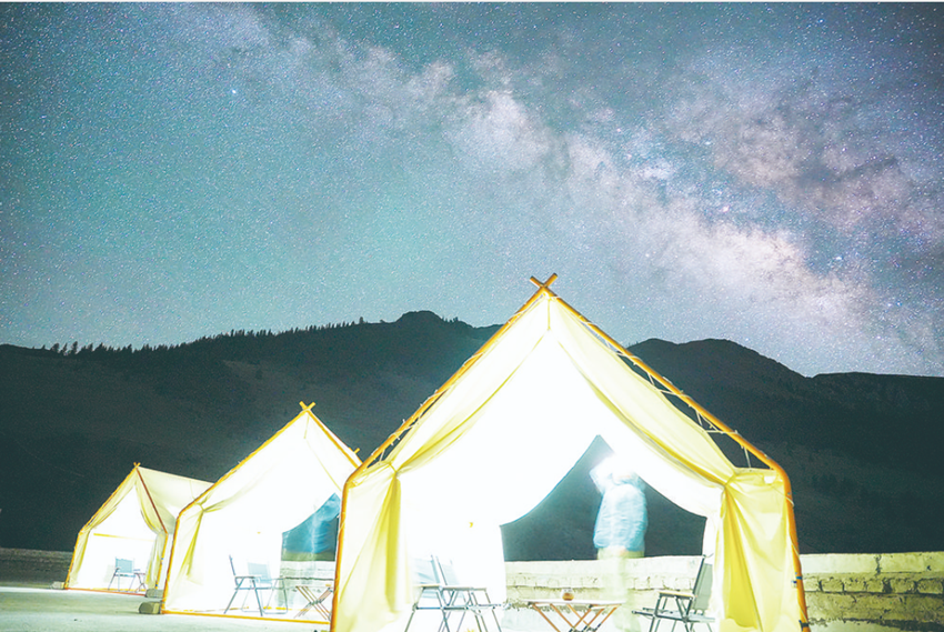 走進(jìn)觀山悅嶺民宿,古樸的藏房與現(xiàn)代簡約設(shè)計(jì)風(fēng)尚相互交融,三五游人閑庭信步、漫步在厚厚的草甸上,清風(fēng)徐徐,坐在星空帳篷中,煮茶品茗,靜靜地感受著時(shí)光流淌。